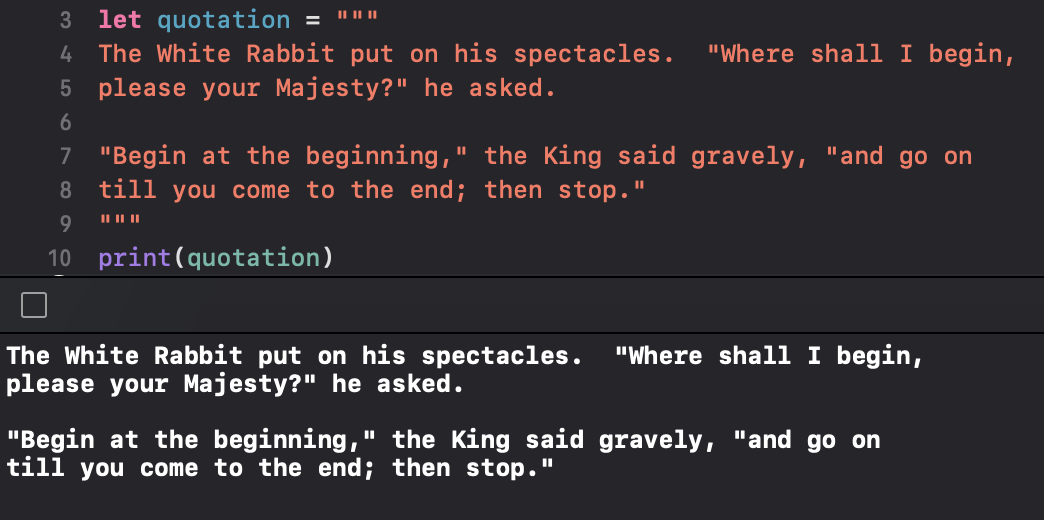 ⌘If you need a string that spans several lines, use a multiline string literal—a sequence of characters surrounded by three double quotation marks