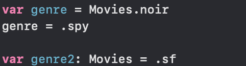 -> 변수나 상수를 해당 열거형 타입으로 초기화하여 타입을 명확히 하였을 때, 다음 번에는 dot syntax와 케이스만을 이용하여 짧게 표현할 수 있다.