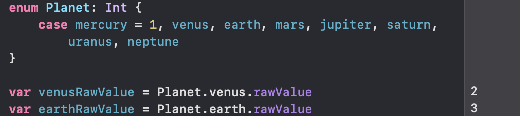 -> 열거형의 원시값에 정수나 문자열을 저장할 때, 반드시 명시적으로 원시값을 할당해줄 필요는 없다. 스위프트가 자동으로 해준다.