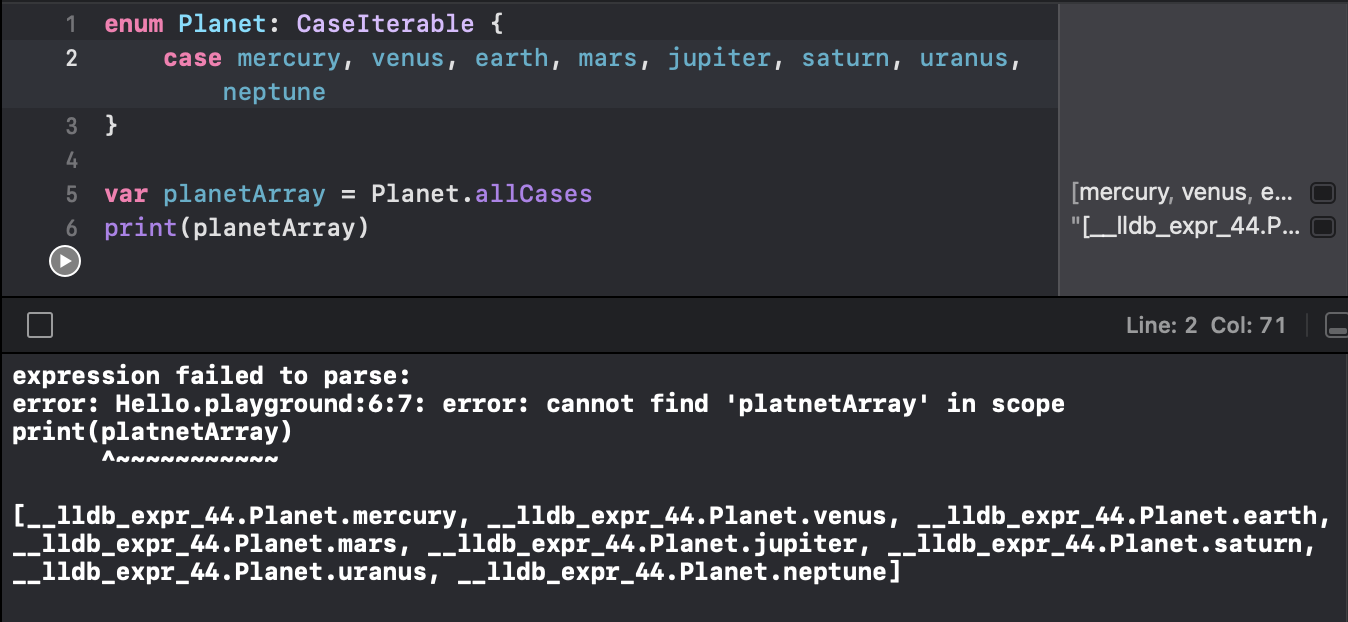 ⌘For some enumerations, it’s useful to have a collection of all of that enumeration’s cases. You enable this by writing : CaseIterable after the enumeration’s name. Swift exposes a collection of all the cases as an allCases property of the enumeration type. Here’s an example