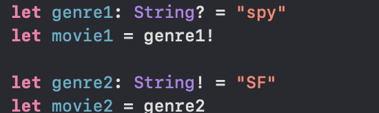 -> 이러한 종류의 옵셔널은 암묵적으로 추출된 옵셔널로 정의할 수 있다. 암묵적으로 추출된 옵셔널은 느낌표를 붙여 사용한다. 옵셔널을 선언할 때 타입명 뒤에 !를 붙여 선언할 수도 있다.