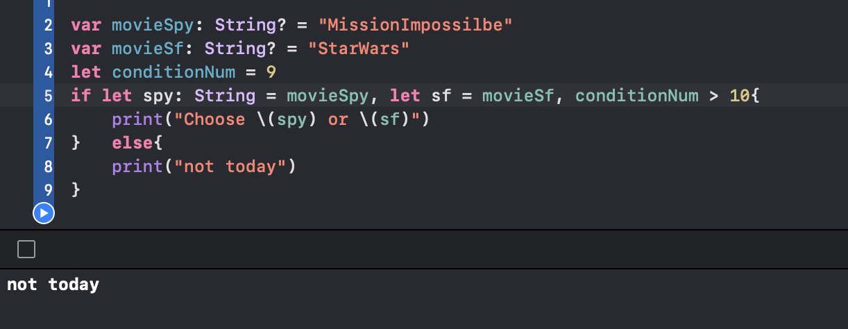 ->하나의 if구문에 여러개의 옵셔널 바인딩과 불리언 조건을 함께 사용할 수 있다. 이 때는 곰마로 구분해야한다. 만약 어떤 옵셔널 바인딩이 nil이거나 조건문이 false가 된다면 if 실행문을 실행되지 않을 것이다.