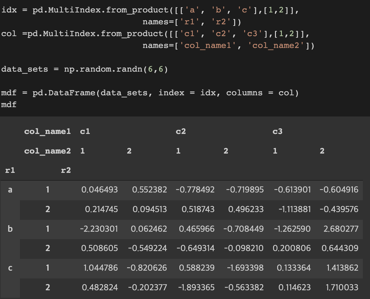 위의 방법들로 멀티 인덱스 혹은 멀티 칼럼을 만들어 pandas객체 인자로 넘기면 멀티인덱스(칼럼)을 가진 데이터셋 만들 수 있음.