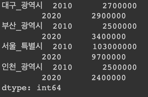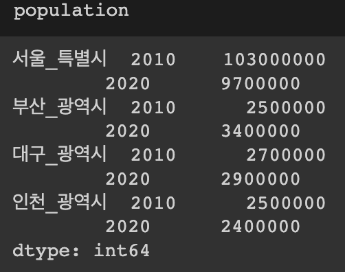 -Sereies에선 딕셔너리의 키값을 튜플로 쌍을 만들어 멀티인덱스 생성. (딕셔너리로 시리즈를 만들땐 키값이 인덱스가 됨)